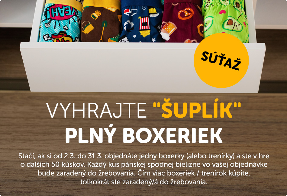 *Súťaž trvá od 2.3. do 31.3.2020 o 23:59. Výhercu/kyňu žrebujeme 4.4.2020 a jeho/jej meno bude zverejnené na www.dedoles.sk/sutaz-suplik-plny-boxeriek a o výhre ho/ju budeme kontaktovať cez e-mail. Výherca/kyňa má právo vybrať si boxerky/trenírky podľa vlastného výberu. Súťaž platí iba pri nákupe pánskych boxeriek a trenírok.